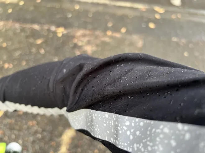 実際に小雨の中を走りましたが、小雨程度であれば十分に水を弾きます。
