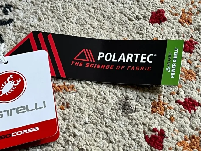 POLARTECのPOWER SHIELDを使っていることを示すタグ。POWER SHIELDはフィルム系の防水透湿で、PFASフリーの新世代素材です。