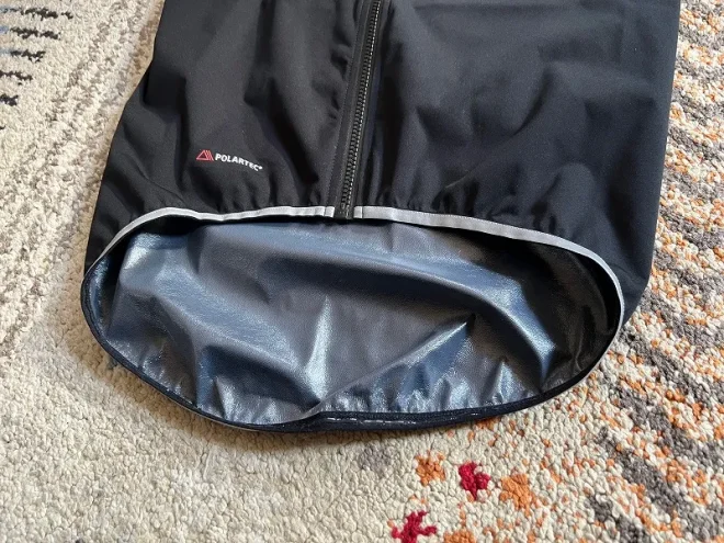 裾と裏地。裾にも反射素材が加工されています。見づらいですがシリコングリップも備わっており、裏地はフィルムがむき出しになっています。