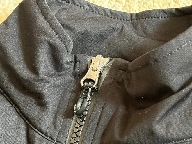 ジッパーは信頼のYKKです。防水のため襟はやや高め。ちなみに雨の直撃を減らすため、ジッパーは中心からややオフセットされています。