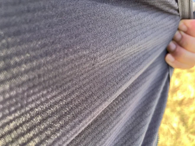 先ほどのスコアリングでは防風:1、通気:5になっていましたが、まさしくその通り。強度を上げても快適です。なるほど、こういう機能の持たせ方もあるんですね…。適度に通気するように、生地の厚さやリブの間隔を調節するのは開発工数がかかったことと想定します。絶妙な通気性です。