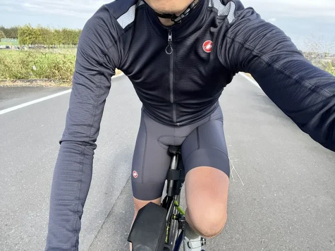 走り出してまず感じたのは、『ESPRESSO THERMAL JERSEY』との違い。ESPRESSOは『しなやか、高いフィット感』が特徴ですが、PURO4はやや『しっかり目』の着用感(※あくまでもESPRESSOと比較して、の話です)。
