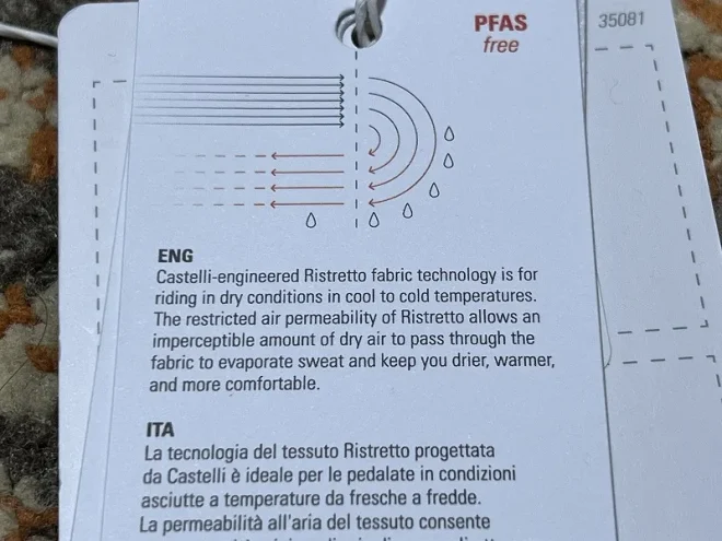2024~2025年にかけて、サイクリング業界に限らずアウトドア業界なども含めてPFASフリーの新製品を競うようにリリースしています。カステリもPAFSフリーの製品をリリースしていますが、単に『PFASを使っていませんよ』という製品を安直に出していない点も購入したポイントです。