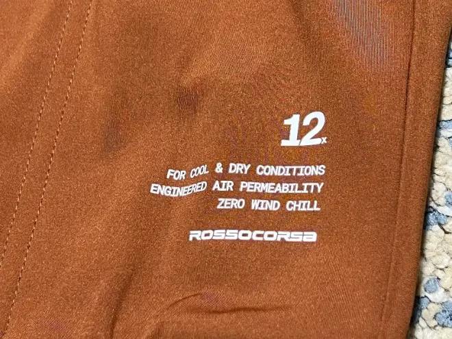 右側ポケット下部には製品コンセプトを表現する文章があり、『FOR COOL&DRY CONDITIONS、ENGINEERED AIR PERMEABILITY、ZERO WIND CHILL』となっています。またレースラインの製品に付される『ROSSO CORSA』であることも示されています。