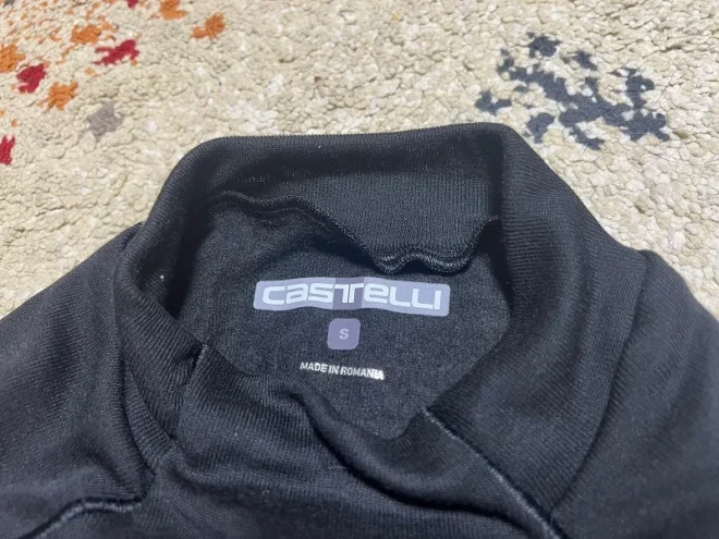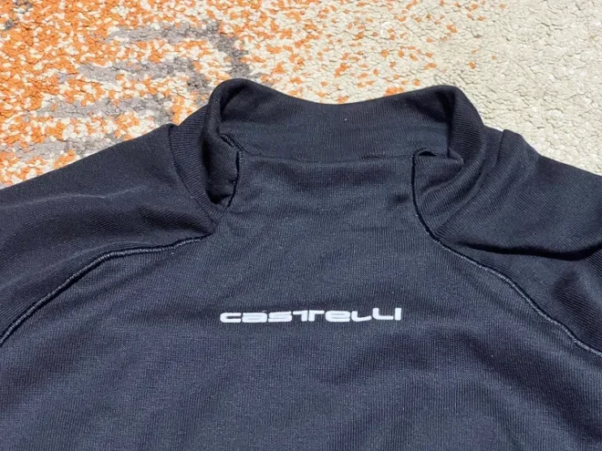こちらが前作です。胸に『castelli』ロゴが入るのは同じですが、肩や脇の縫い目が多い(パネルが多い)ことが分かります。こちらも『フラットロック縫い』というフラットな縫い目になっているのですが、本製品と比べると縫い目が幅広で目立ちますね。