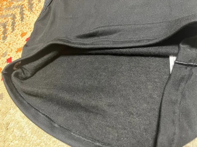 まずは全景です。今回のカラーはブラック。縫い目が減ってシンプルな見た目になりました。縫製自体も改善されていて、『Merrow(メロー)ステッチ』という名称が付いており、幅が小さくなっています。