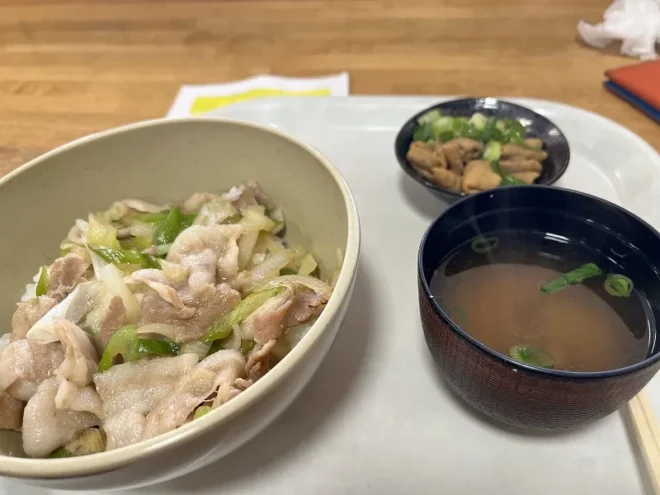 食券を買って受付に提出、待つこと約15分。肉を食べたかったので、肉丼とモツ煮です。