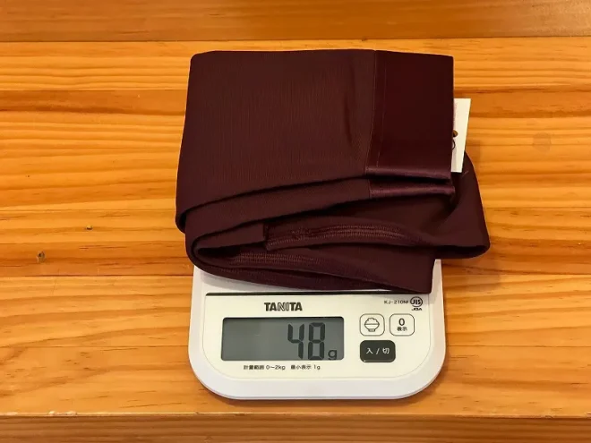 実測重量はSサイズで48gでした。かなり軽量なので、気軽にバックポケットに忍ばせておけますね。