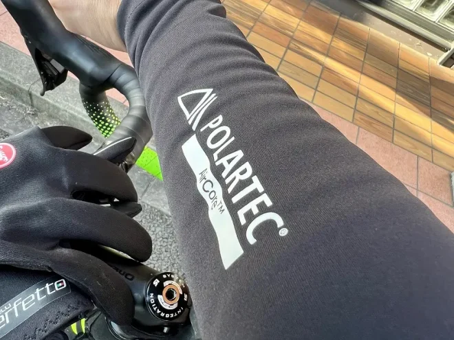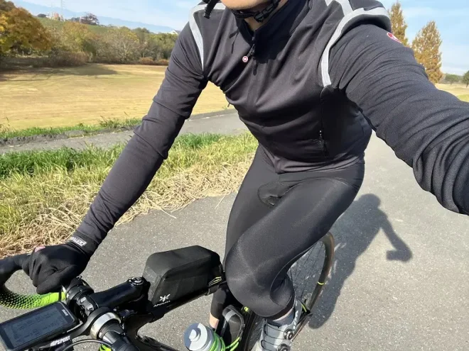 着用して実際に走行しました。この日は11月中旬にしては比較的暖かい日でした。走り出しの気温は9度、2時間ほど走った後は実に14度と対応温度帯の上限まで上がりました。合わせたベースレイヤーは、対応温度帯が-2~10度の『FLANDERS2LONG SLEEVE』です。