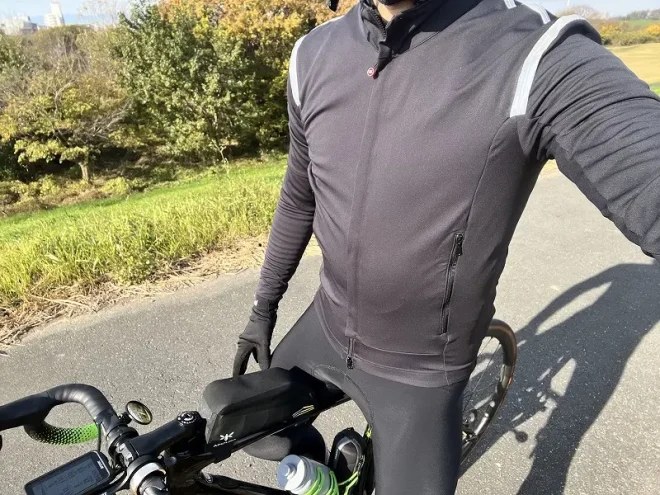 荒川の堤防上にあるCRに出て、まず感じるのは防風性の高さ。10度未満の気温の中を30km/h前後で走っているのですが、しっかりと風を防いでいます。従来のPerfettoと比較して2/3の重量になっており明らかに生地が薄いのですが、防風性は同等。AirCore、すごい。