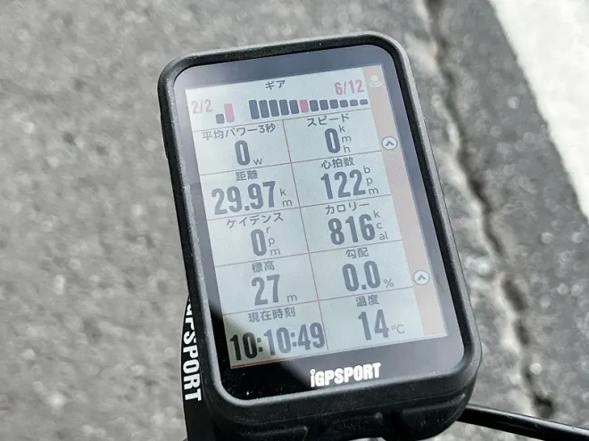 そのまま強度を上げて、さいたま市から30km先の川島町まで一気に走ります。気温は14度を示しており、ベースレイヤーのFLANDERS2の気温上限を超えています。