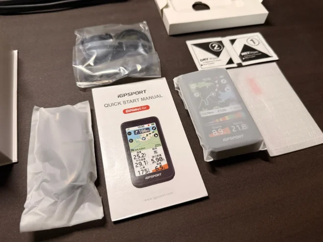 同梱品は以下の通り。左からUSB Type-Cケーブル、Garmin互換マウント&ストラップ、クイックマスタートニュアル、クリーニングワイプ、液晶保護シートです。iGPSPORTのサイコンはBiNaviに限らず液晶保護シートやシリコンケースがデフォルトで付属している機種が多いので、非常に評価できる点です(残念ながらBiNavi Airにはシリコンケースは付属せず)。