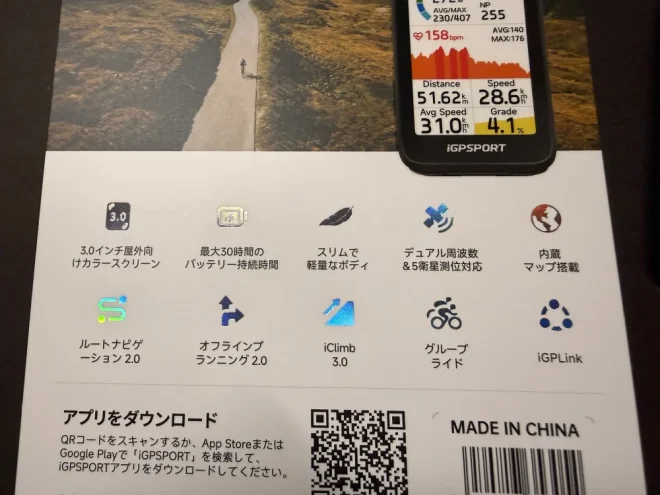 パッケージ裏側には製品特徴が列記されています。トピックスとしては、iClimbが3.0に進化したこと、グループライド機能の搭載、サイコンから他デバイス(ライトやウォッチ)をコントロール可能な機能に『iGPLink』という呼称が付いたことでしょうか。