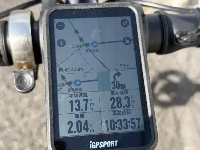 またナビの実行中にiGPSPORTアプリと接続しておくと、右左折の情報をスマホから音声ガイドしてくれます。画面を見ていなくても右左折ポイントに気付くので地味に便利です。使う場合はスマホの音量を最大にしておきましょう。