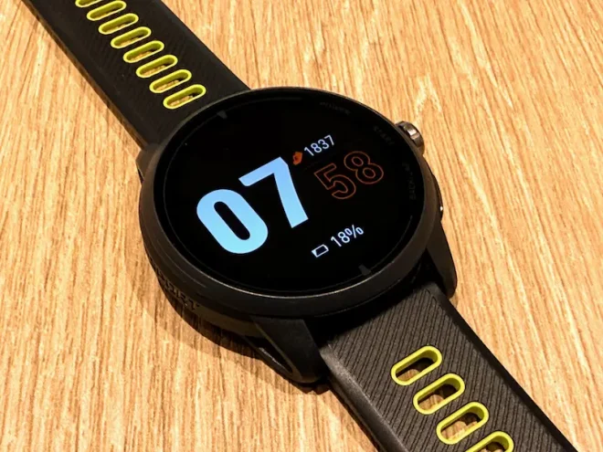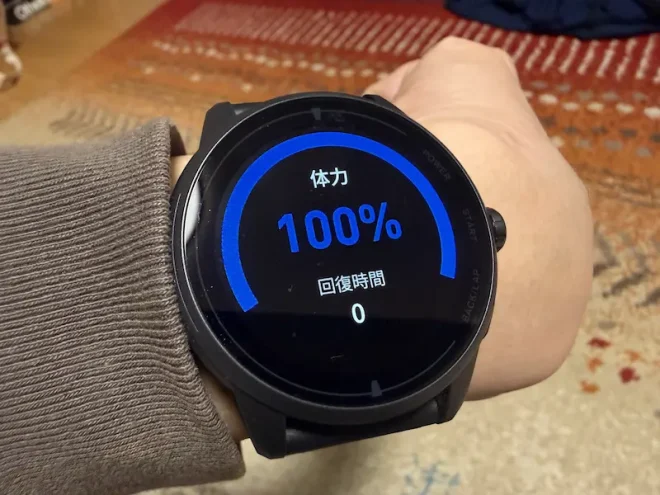 VeRunのAMOLEDディスプレイは466×466の解像度を持っており、同価格帯の競合製品の中では最高クラスの見やすさ。アクティビティ中にチラ見することが多いスポーツウォッチにおいて、視認性の高さは快適さに直結します。