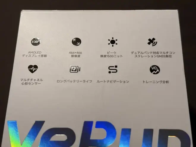 パッケージは立方体に近い形状で、側面に製品特徴が記載されています。主な内容は先ほど記載した通りのほか、ルートナビやトレーニングの分析が可能となっています。