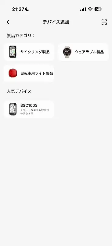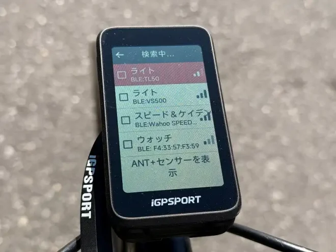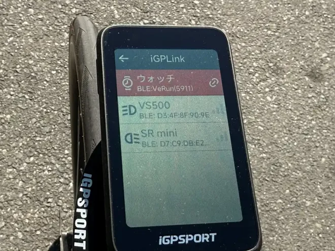 続いてサイコン側(画像はBiNavi Air)でiGPLinkのメニューを開き、デバイスを検索。ウォッチが見つかったら接続します。