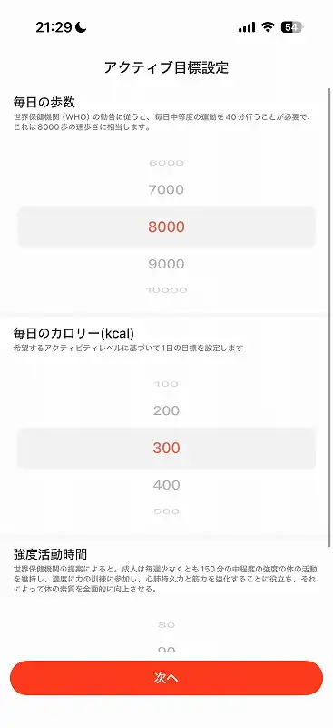 - アクティブ指標設定:デイリーの歩数目標などを設定。
