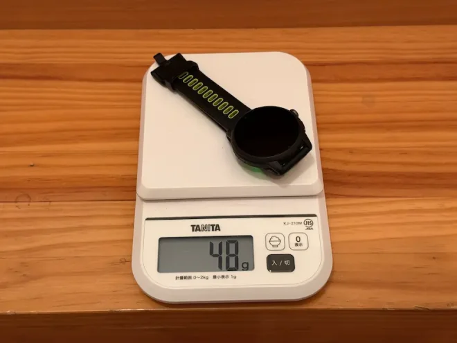 実測重量はシリコンバンド込みの公称47.6gに対して48gと公称通りでした。本体のみであれば、32.5gとのこと。画面サイズの大きさを考慮すると、軽量な部類といえます。