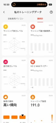 こちらがランニングの評価項目です。走り込みが足りていないので、一部の項目が未評価になっています…。データを蓄積するとフルマラソンの完走時間の予測もしてくれるようになります。