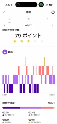 睡眠のモニタリングにも対応しており、スコアが表示されます。昼寝も識別してくれるとのこと。