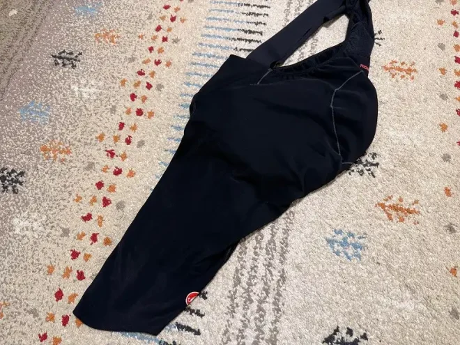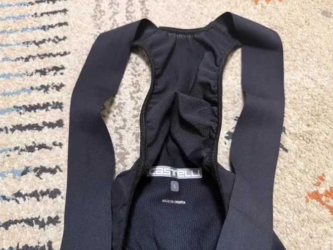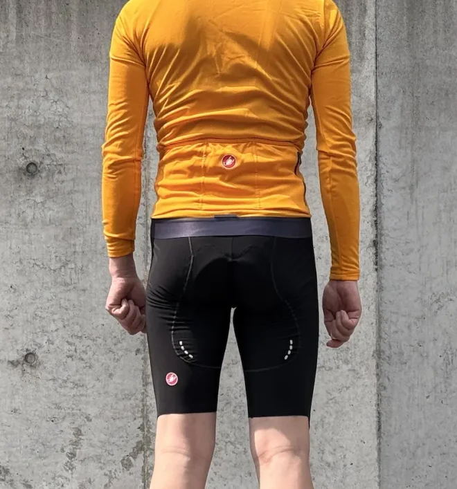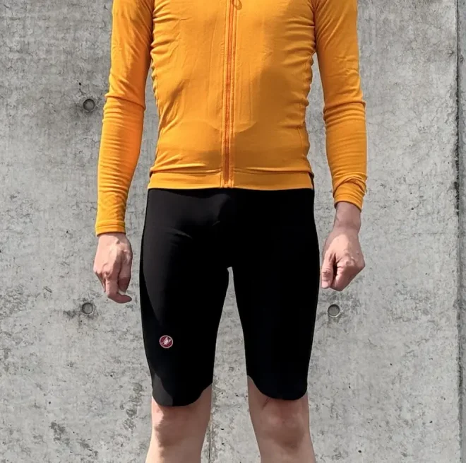 これがビブショーツだと生地が夏向けで薄いですから、10~15度のような気温だと寒いのですよね。特にガードしたい下腹部がペラペラ生地なので、腹の調子が悪くなることが…。