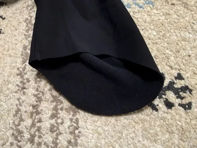 また本製品の特徴でもある裾の長さですが、膝を曲げるとこんな感じで程よくカバーしてくれます。前側が長くなっている仕様も、良く出来ていると感じます。