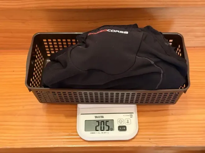 Lサイズの実測重量は205gでした。公称重量は247gなので2割ほど軽くなっています。