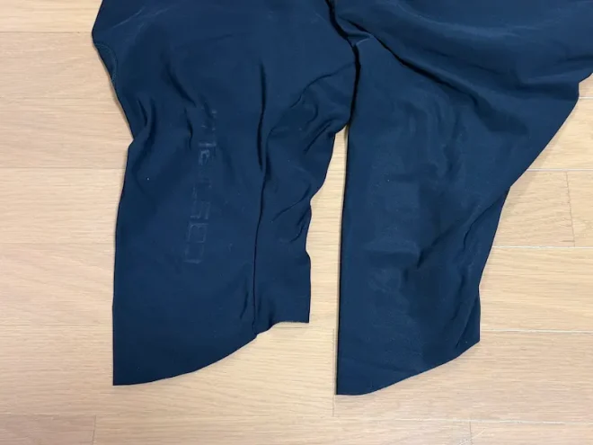 ここまで裾を長くしてしまうと、仮にグリッパーが備わっていたらペダリングが阻害されてしまいますが、本製品は切りっぱなし。Thermoflexは伸縮性も高いのでペダリングもスムースです。この快適さをぜひ体験して欲しいところ。