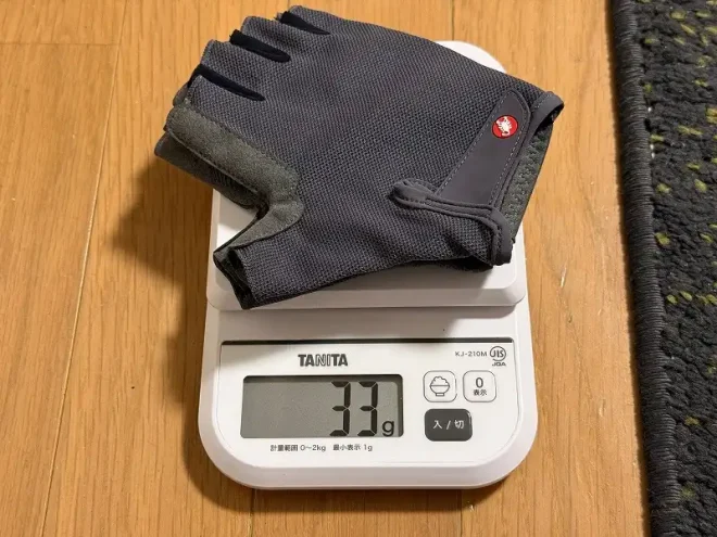 実測重量は、左右で33g(Mサイズの場合)。公称49g(Lサイズ)と比較するとかなり下回っています。
