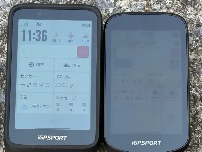 メイン画面での比較です。同じ320×480の解像度ですが、液晶の違いでこれだけ明るさが違います。製品の方向性の違いからBiNaviには反射型の液晶が使われており、BSC500はTFT液晶が使用されていると思われます(スマートウォッチでは主流な有機EL(AMOLED)か?と思いましたが、流石に有機ELではなかった)。